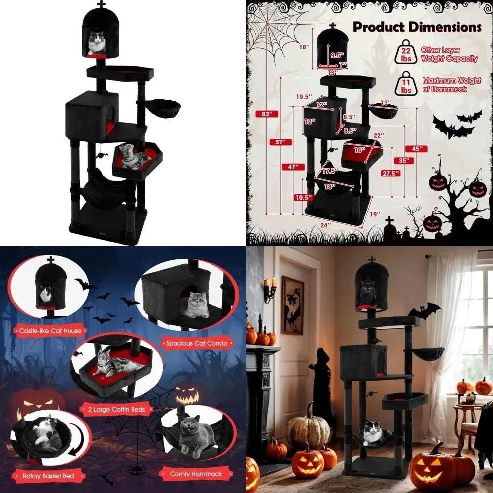 Gothic-Style 83 Inch Tall Cat Tower with Multi-Level Halloween Theme, Coffin Beds, Scratching Posts, 2 Condos, Dangling Toys for $110.24