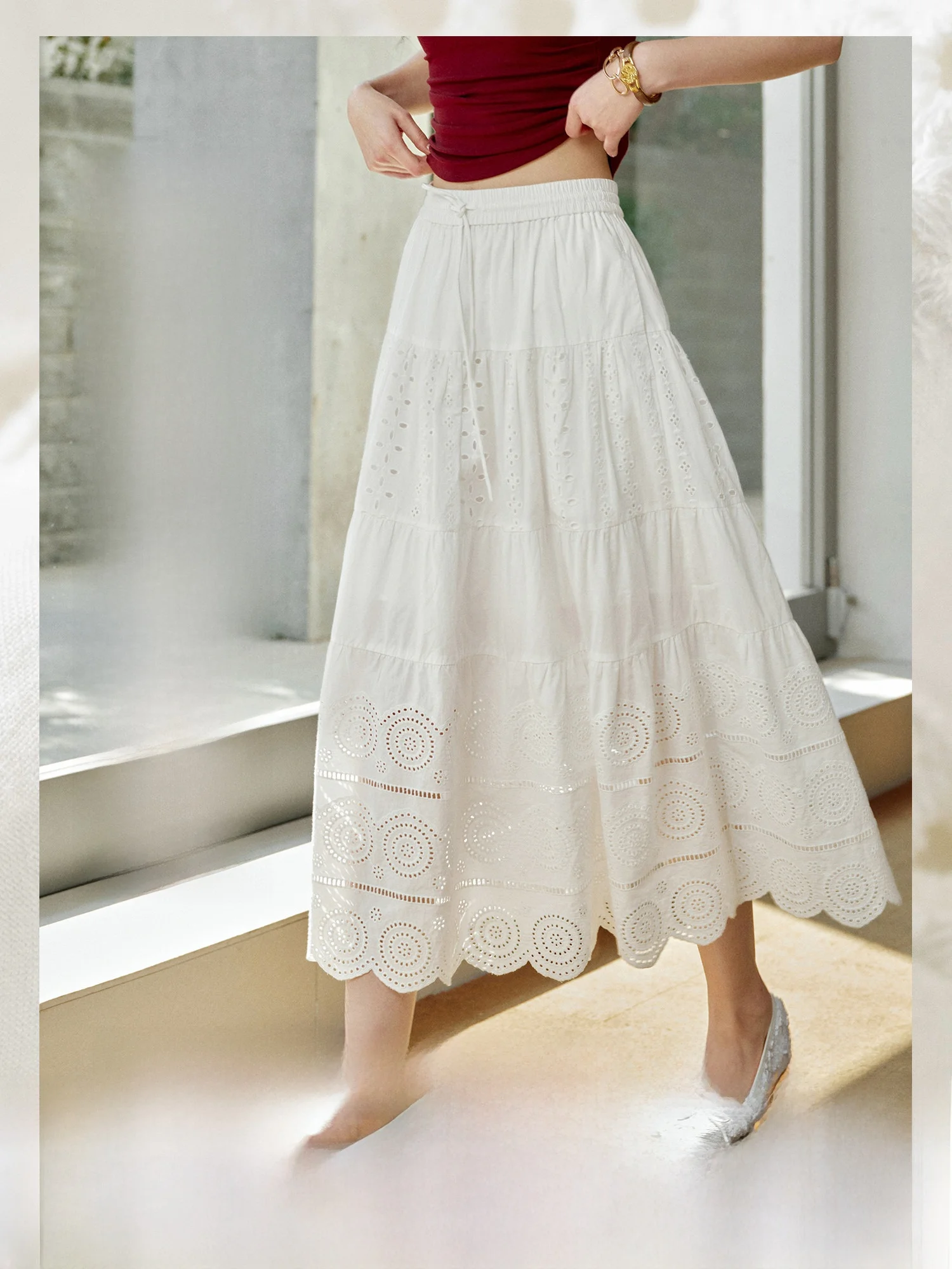 Ele White Embroidered A-Line Skirt with Umbrella Hem Artistic Sense Pumpkin Valley Moonlight Waltz New 2025 Cotton Midi S... $89.63