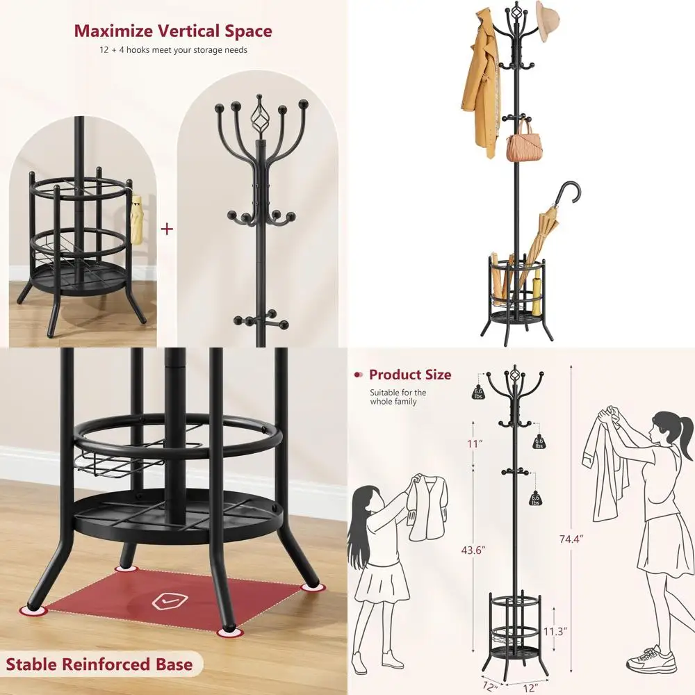 Freestanding Coat Rack with Umbrella Holder, 12 Hooks for Clothes and Hats, Ideal for Bedroom, Office, Living Room - Black $62.59