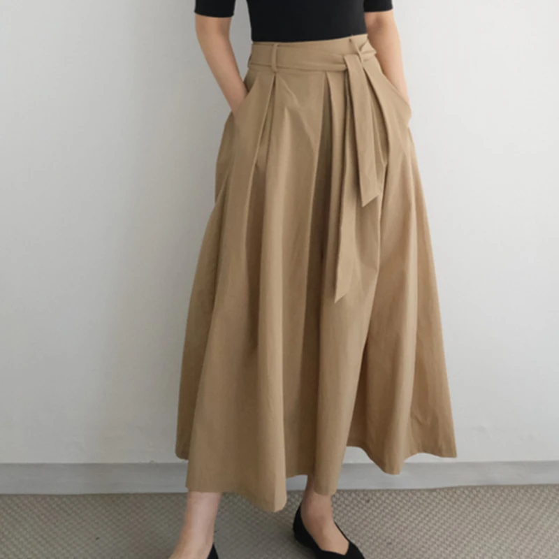 REALEFT High Waist Elegant Women's Umbrella Skirts Sashes 2025 New Solid Korean Casual Loose A-line Midi Skirts Pockets Female $20.06