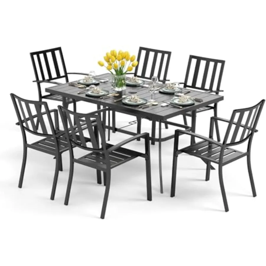 7 Piece Outdoor Dining Set for 6 with 60 Rectangular Metal Steel Table and Umbrella Hole Stacking Wrought Iron Chairs Black Lar $592.69