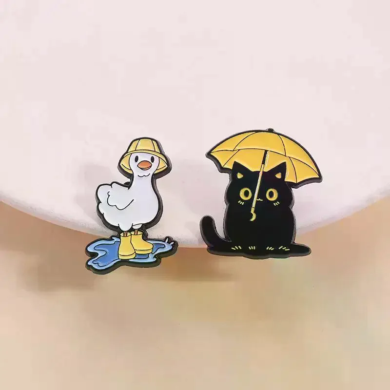 Funny Black Cat With Umbrella Enamel Pins Duck With Rain Boots Metal Brooches Lapel Badge Jewelry Gifts For Friends $2.23