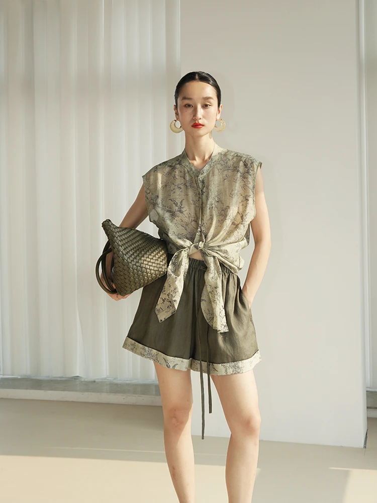 Hand Printed Silk Linen oulder Bared Cover up irt Umbrella Skirt orts LemonChen Cold Water Ink Floral Women's Faion Set $86.19