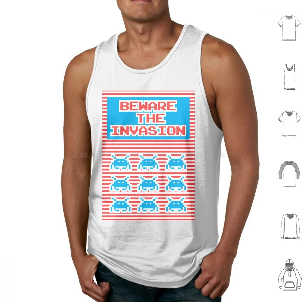 Beware The Invasion Tank Tops Print Cotton Funny Humor Funny Design Humor Design Geek Arcade Videogame Video Game Gamer $13.12