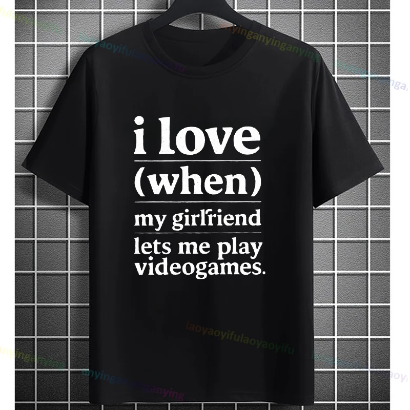 Funny I Love My Girlfriend When Lets Me Play Videogames Print Graphic T-Shirt Casual Short-sleev Crewneck Pure Cotton Tshirt $4.47